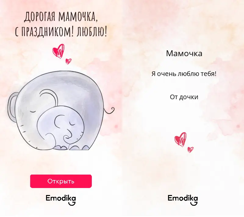 На сервисе Emodika можно не только подобрать крутой подарок, но и завернуть его в онлайн-открытку с пожеланием. Получится очень красиво и душевно. А отправить можно прямо в мессенджер, например, Whatsapp, Telegram или Viber.