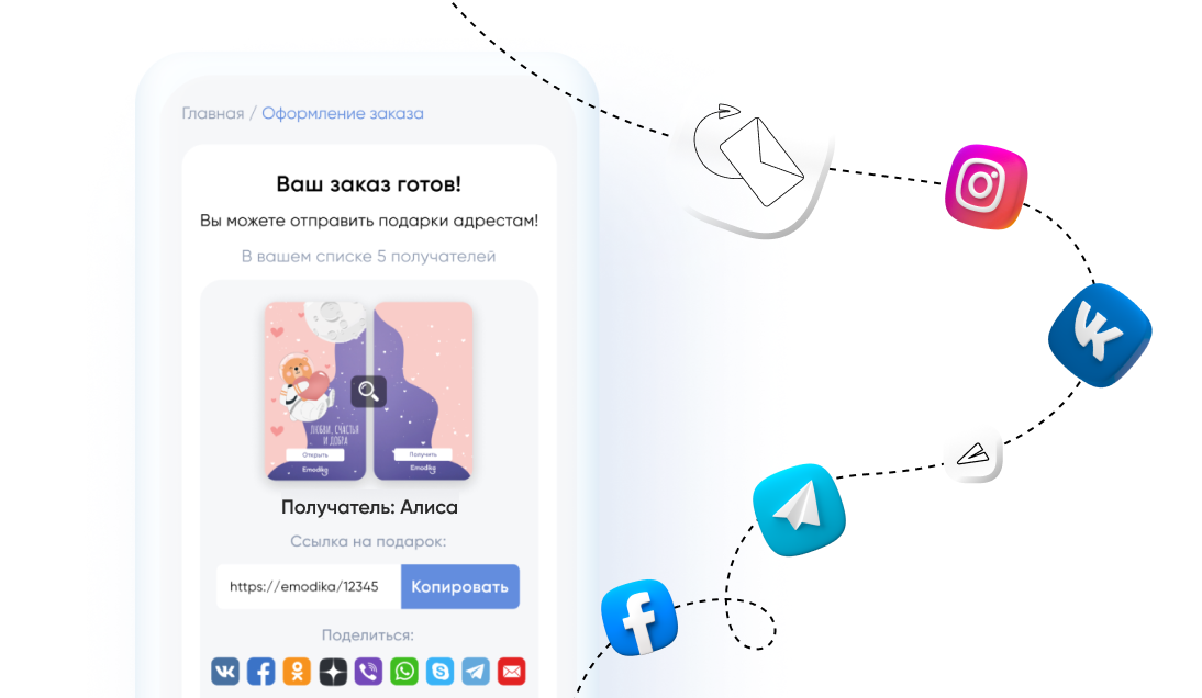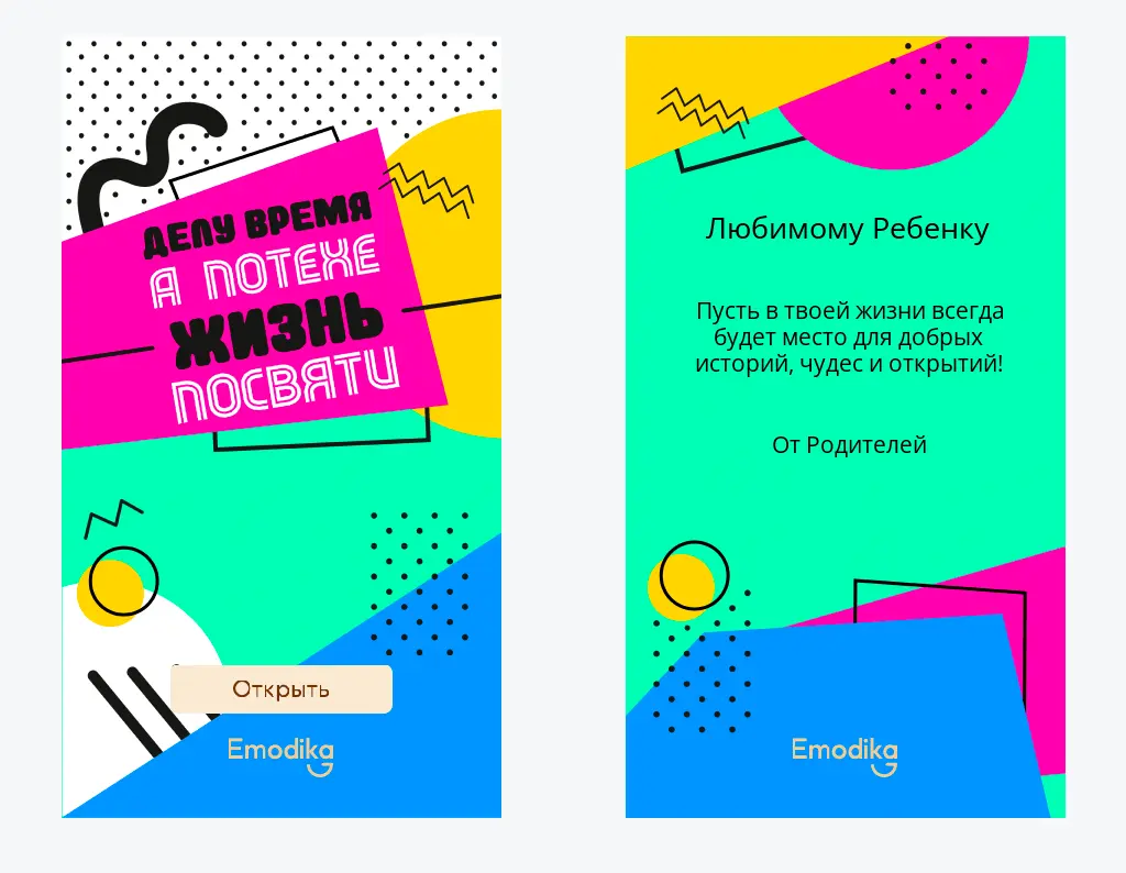 Подарки на Emodika можно дарить в онлайн-открытке. Просто выберите понравившуюся открытку и добавьте ее к подарку — так поздравление будет выглядеть более лично, тепло и празднично. Как это выглядит, можно посмотреть по ссылке.